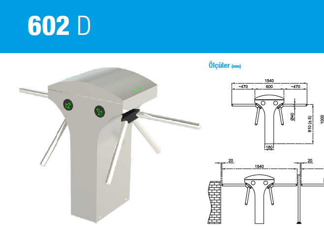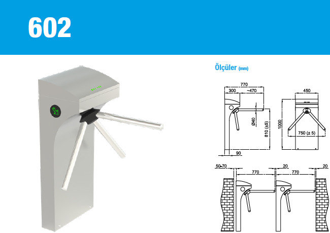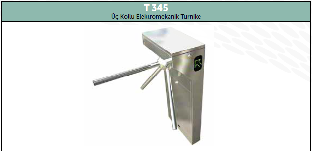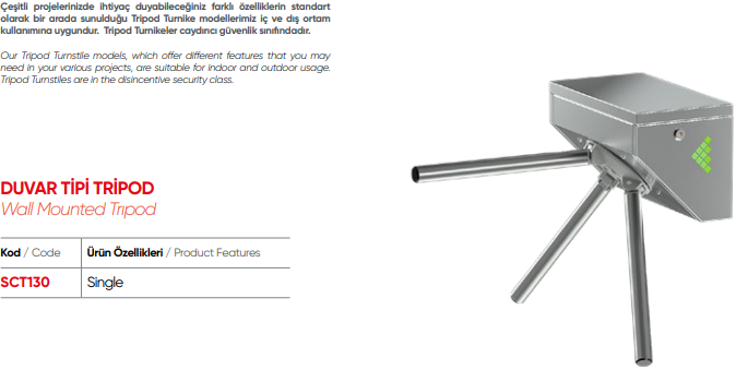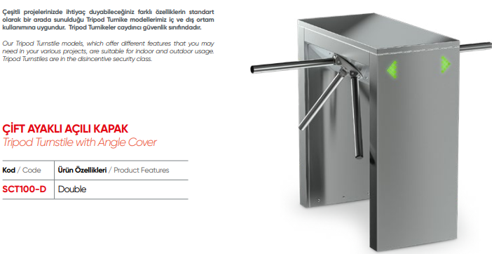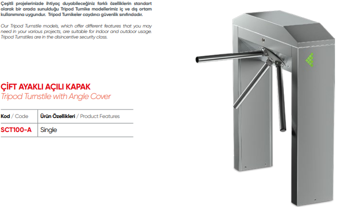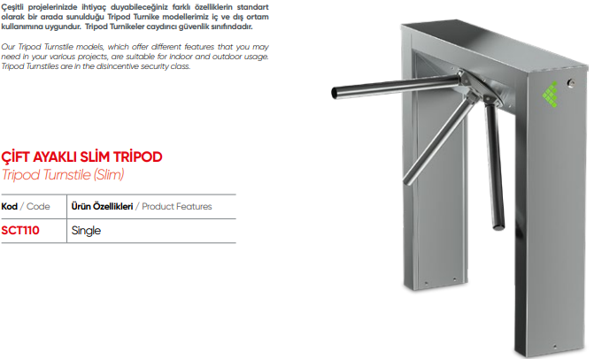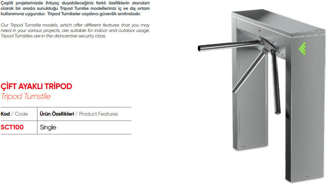 Tripod ( Üç Kollu ) turnikeler özellikle; toplu taşıma alanları, üniversiteler, bankalar, iş merkezleri, müzeler, gibi yoğun geçişlerin olduğu, geniş model çeşitliliği ile farklı proje alanları için tasarlanan, dayanıklı, güvenilir ürünlerdir.Standart 304 paslanmaz çelik tripod turnikeler, özel hassas döküm teknolojisi ile üretilerek, turnikenin uzun yıllar çalışması güvence altına alınır.